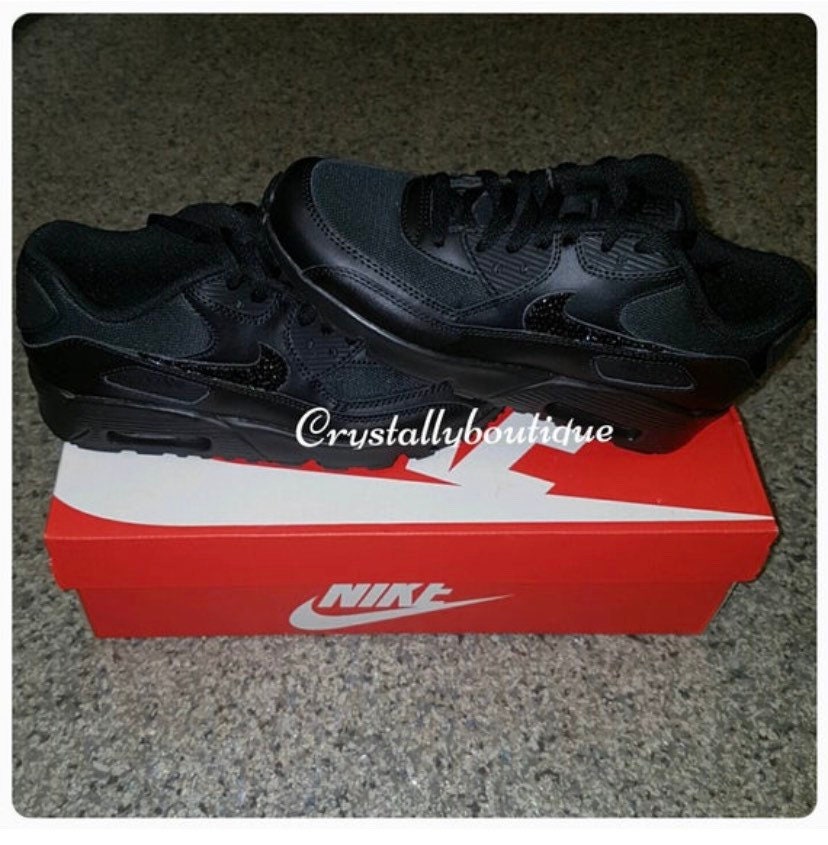 Junior Customised Tick w/ Swarovski & Rhinestone Nike Air Max 90 Black size 3 4 5 5.5 UK Brand New!