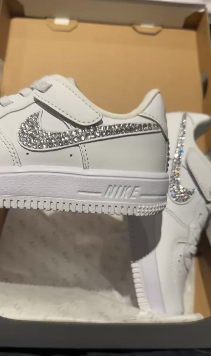Youth Kids Swarovski & Rhinestone Customised Nike Airforce Ones White size 10 11 12 1 2 UK Brand New!