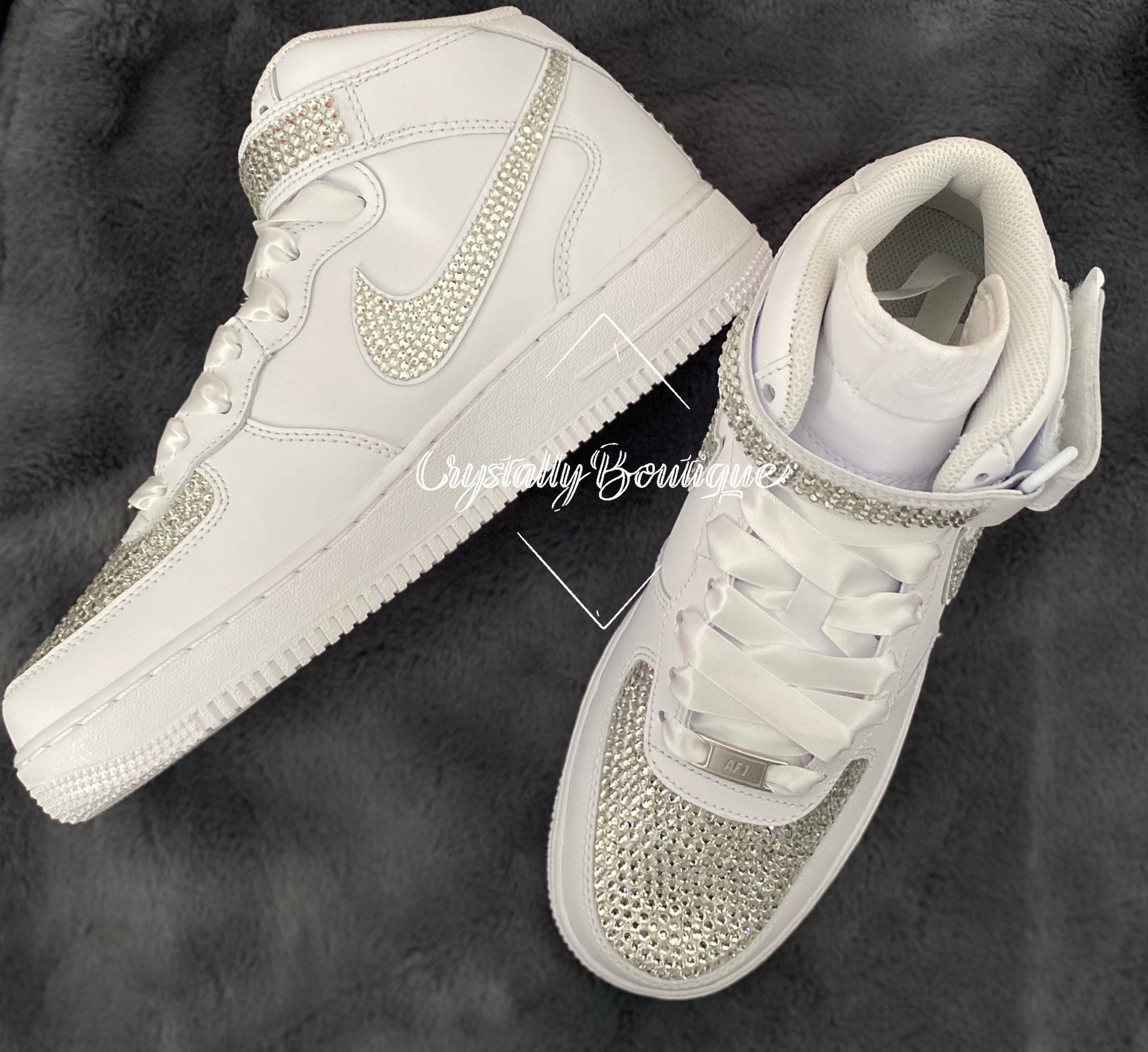 SALE Size 6UK Nike Air Force Ones Mid customised Bling Toes, Ticks & Strap Swarovski mix with Rhinestone Clear Crystal White Leather